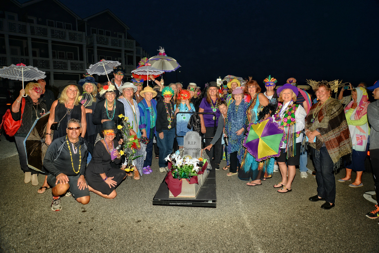 In October of each year, the Town hosts a jazz funeral to mourn the end of summer. A jazz band leads a procession of mourners and the casket of summer to the pavilion. The band then performs to celebrate summer. All are invited to participate in the procession. Don't forget your funeral finery, masks and beads. Even if you do, don't fret, the Town has some available.